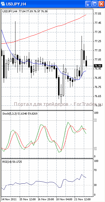Цены тестируют уровень 77.00, но уже как поддержку. Если он будет преодолен, продолжится падение, первичной целью которого, скорее всего, станет отметка 76.60/50. Однако на 4-х часовом графике (рис.1) МА (100) уверенно устремлена в бычьем направлении. Вверх направлена и МА (10). Все это позволяет ждать, что данное движение станет всего лишь коррекцией и после ее завершения цены возобновят рост и еще раз попытаются преодолеть сопротивление 77.30.