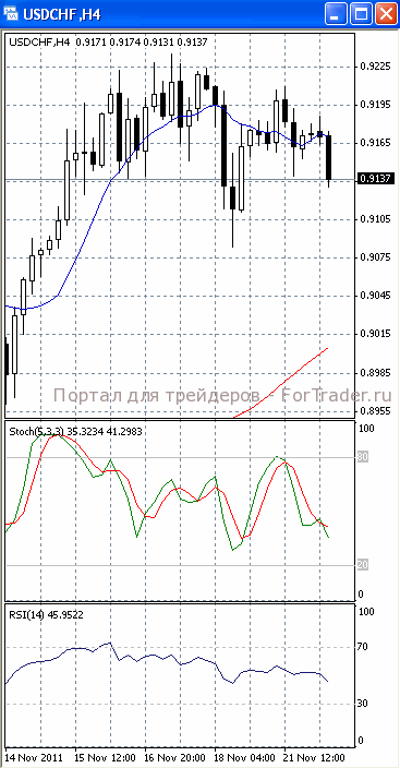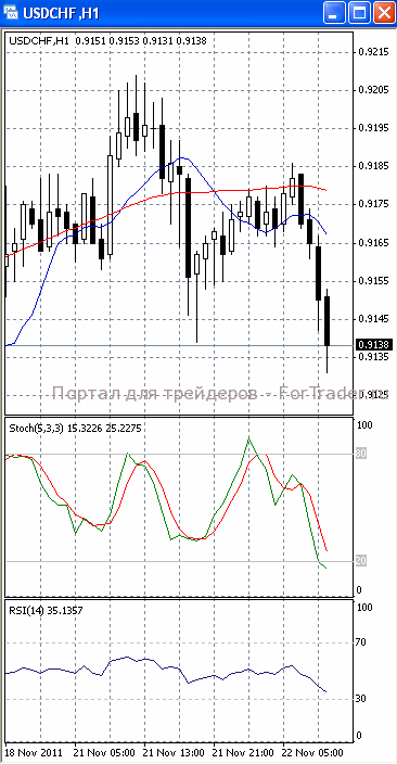 На часовом графике (рис.2) и «быстрая», и «медленная» скользящие средние направлены вниз, тем самым, подтверждая предположение о вероятности прорыва указанного уровня поддержки и дальнейшего падения. В медвежьем направлении устремлен и RSI. SS входит в зону перепроданности, сигнализируя в пользу возвратного хода к отметке 0.9150.