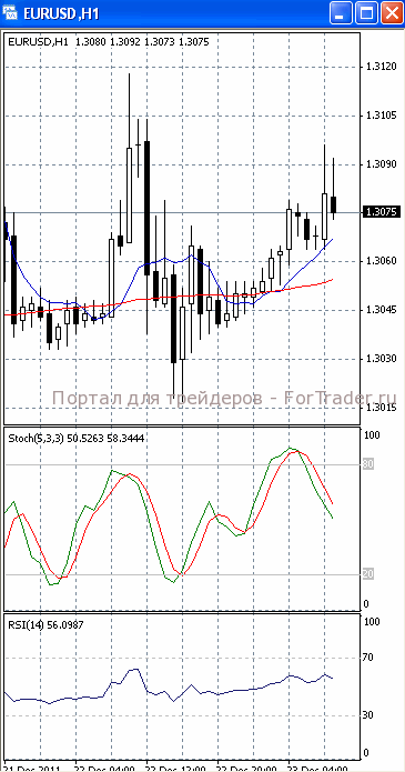 На часовом графике (рис.2) «быстрая» скользящая средняя устремлена в бычьем направлении. Вверх развернулись и SS, и RSI. Все это подтверждает предположение о возможности прорыва указанного уровня сопротивления и продолжения роста.