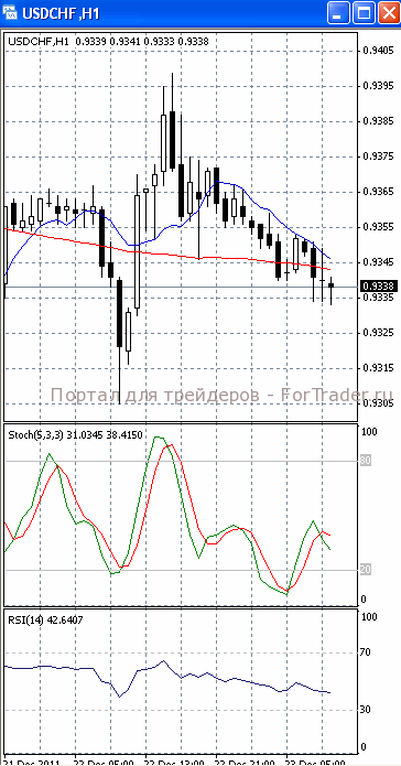 Ситуация на часовом графике (рис.2) подтверждает предположение о возможности развития нисходящей фазы движения. И МА (100), и МА (10) направлены вниз. В медвежьем направлении устремлены и SS, и RSI.