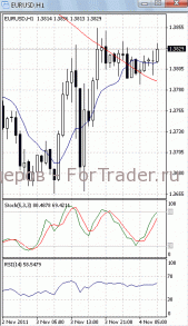 На часовом графике (рис.2) «быстрая» скользящая средняя также приобретает восходящую направленность. Вверх устремлены и оба осциллятора. Все это подтверждает предположение о возможности прорыва указанного уровня сопротивления и продолжения фазы роста. Но МА (100) все еще уверенно устремлена вниз, сигнализируя о вероятности сохранения потенциала нисходящего движения.