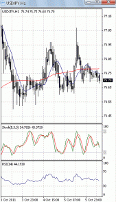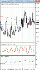 Цены все еще консолидируются в районе уровня поддержки 76.60/50. Если им все же удастся его преодолеть, продолжится падение, первичной целью которого, скорее всего, станет отметка 76.30. О возможности такого исхода позволяет говорить то, что на 4-х часовом графике (рис.1) МА (10) приобрела нисходящую направленность. В том же направлении развернулись и оба осциллятора. В то же время МА (100) наметила разворот в бычьем направлении. Поэтому не стоит полностью исключать вероятность возвратного хода к отметке 77.00 и повторного ее тестирования.