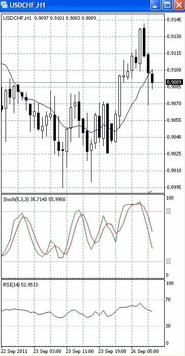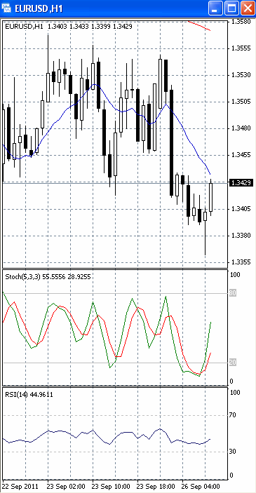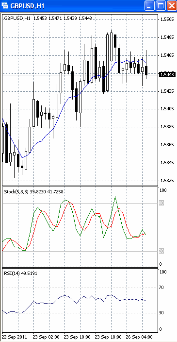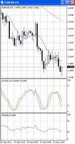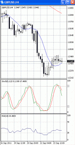 На часовом графике (рис.2) МА (100) и МА (10) достаточно уверенно устремлены вниз, тем самым, подтверждая предположение о возможности возобновления нисходящего движения. SS и RSI направлены вверх и пока не подают признаков разворота.