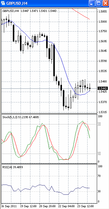 Цены возвращаются к уровню поддержки 1.5430. Если им удастся его преодолеть, продолжится падение, первичной целью которого, скорее всего, станет отметка 1.54. Однако на 4-х часовом графике (рис.1) МА (10) приобретает восходящую направленность. Вверх наметил разворот и осциллятор RSI. Все это позволяет предположить, что после отката цены возобновят подъем к отметке 1.55. В то же время, «медленная» скользящая средняя достаточно уверенно направлена вниз. Поэтому вполне возможно, что цены продолжат нисходящее движение.