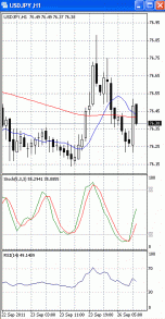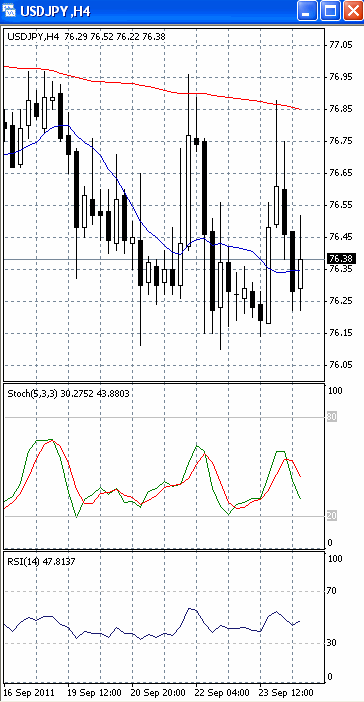 Цены остаются в районе уровня поддержки 76.30. Если он все же будет преодолен, стоит ждать дальнейшего падения, первичной целью которого, скорее всего, станет отметка 76.00. В пользу такого исхода позволяет говорить то, что на 4-х часовом графике (рис.1) МА (100) приобретает нисходящую направленность. В медвежьем направлении устремлен и осциллятор SS. В то же время RSI развернулся в противоположную сторону. Поэтому не исключено, что цены поднимутся к отметке 76.60.