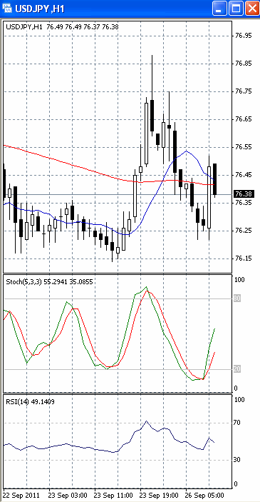 На часовом графике (рис.2) скользящие средние готовятся сформировать «медвежье» пересечение, что может стать сигналом на продажу и дополнительным подтверждением предположения о прорыве уровня поддержки 76.30. SS и RSI развернулись разнонаправлено (как и на 4Н).