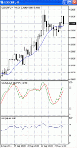 Цены пытаются зафиксироваться ниже уровня поддержки 0.91. Если им это удастся, стоит ждать дальнейшего падения, первичной целью которого, скорее всего, станет отметка 0.9050. О начале падения своим разворотом сигнализировали осцилляторы, которые на 4-х часовом графике (рис.1) наметили разворот вниз. МА (10) приобретает восходящую направленность. Поэтому вполне возможно, что после отката цены возобновят рост.