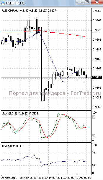 На часовом графике (рис.2) «медленная» скользящая средняя устремлена вверх, тем самым, подтверждая предположение о возможности возобновления фазы роста. «Быстрая» скользящая средняя и SS разворачиваются вниз, сигнализируя в пользу падения.