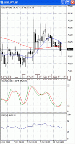 На часовом графике (рис.2) МА (10) приобрела нисходящую направленность, сигнализируя в пользу тестирования нижней границы диапазона. К тому же скользящие средние готовятся сформировать медвежье пересечение, что также будет свидетельствовать в пользу падения. SS и RSI развернулись в бычьем направлении, что сигнализирует в пользу роста к отметке 77.00.