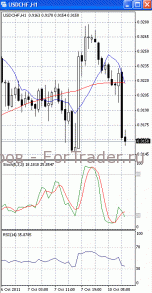 На часовом графике (рис.2) обе скользящие средние приобрели нисходящую направленность. К тому же они формируют «мертвый» крест. Все это подтверждает предположение о возможности прорыва указанного уровня поддержки и дальнейшего падения цен. В то же время RSI наметил разворот в противоположном направлении. Поэтому все же не стоит полностью исключать вероятность возвратного хода к отметке 0.92.