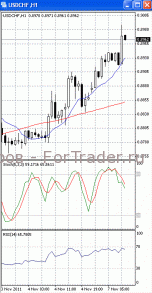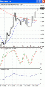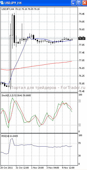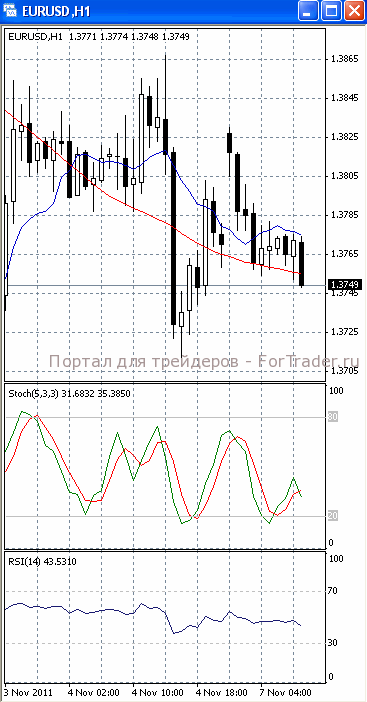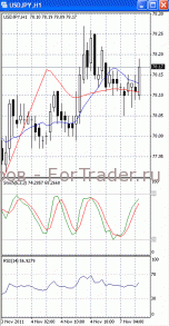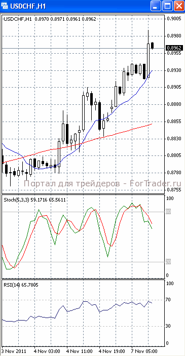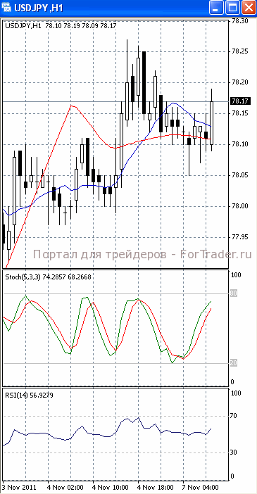На часовом графике (рис.2) ситуация складывается аналогичным образом. И «быстрая», и «меленная» скользящие средние устремлены вверх, тем самым, подтверждая предположение о развитии восходящего движения. SS и RSI развернулись вниз, сигнализируя в пользу возвратного хода.