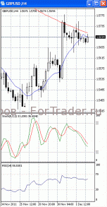 Основное движение происходит в диапазоне 1.3430 – 1.3515. В настоящий момент цены тестируют поддержку 1.3460/50. Если она будет пройдена, стоит ждать дальнейшего падения, первичной целью которого, скорее всего, станет нижняя граница канала и, далее, 1.34. В пользу такого исхода позволяет говорить то, что на 4-х часовом графике (рис.1) МА (100) все еще уверенно устремлена вниз. Вниз направлен и SS, который пока не подает признаков разворота. В том же направлении разворачивается и МА (10). обе скользящие средние уверенно устремлены вниз.RSI наметил разворот в противоположную сторону, сигнализируя в пользу начала фазы роста в пределах указанного канала.