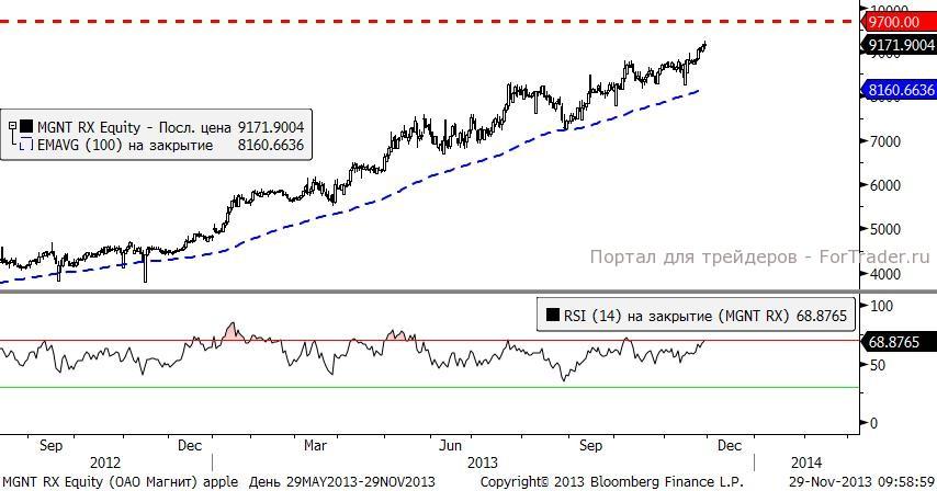 Акции Магнит, сильно коррелирующие с акциями американского WalMart, вновь «рисуют» исторический максимум. В условиях когда трейдерам нет возможности опираться на исторические уровни приходит на помощь проекция Фибоначчи. Применив ее, можно утверждать, что 9700 руб. это последний рубеж ценового максимума, после чего последует сброс акций.