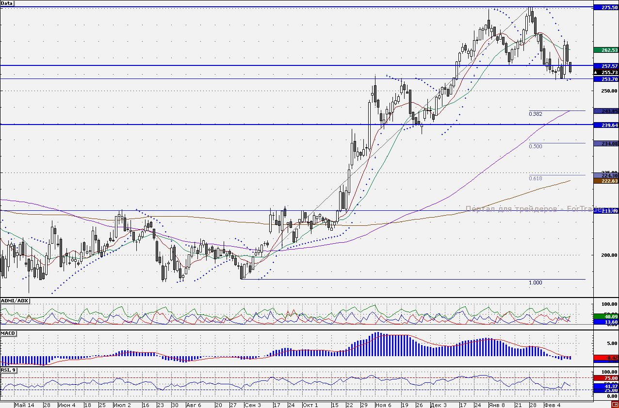 На графике акций «Роснефти» была образована фигура разворота тренда «двойная вершина». В течение текущей недели акции торгуются вокруг линии «шеи» — 257,57 руб. Закрепление акций ниже данной отметки поставит цель в районе 240 руб. Наиболее вероятно, что «медвежьи» планы все же будут реализованы. Индикатор MACD(12;26;9) снижается на отрицательной территории. Индикатор ADMI/ADX показывает, что силы «медведей» по бумагам преобладают (линия «медведей» находится выше линии «быков»). Ближайшей поддержкой для акций выступает отметка 253,70 руб., далее 250 руб. Таким образом, инвесторы более склонные к риску могут продолжать удерживать короткие позиции по бумагам с ближайшей целью 250 руб. Наш 30-минутный торговый робот открыл короткие позиции от отметки 258,89 руб. и пока удерживает их.