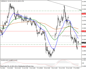 На часовом ценовом графике видим длительное движение в диапазоне 32.82-32.09 пунктов. В краткосрочной перспективе вновь ожидаем движение к верхней границе диапазона, поэтому рекомендуем вставать в покупку.