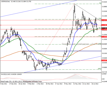 На дневном графике видим треугольник, происходит отскок от поддержки 32.09 пунктов в направлении взятия краткосрочной цели. Взяв в основу свойства данной технической фигуры, отмечаем цель 30.91 пунктов (61.8% уровень Фибоначчи), к которой будет направлен импульс после прощупывания линии верхней границы треугольника. В среднесрочной перспективе ожидаем укрепление российской валюты к максимальному коррекционному уровню, а в долгосрочной — 36.55 пунктов.