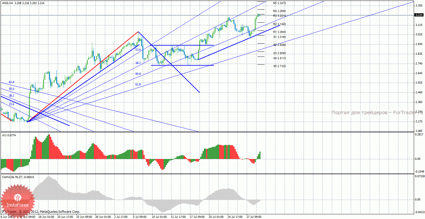 Анализ природного газа за 31 июля показывает, что восходящая линия тренда перестроена и теперь градус ее наклона меньше, а сама линия сильнее, поэтому рост инструмента продолжается. Целями для продолжения восходящего движения выступают уровни сопротивления 3,2210, 3,2690 и 3,3470. А вот закрепление ниже восходящей линии тренда или уровня R2 – 3,1420 может указать на коррекцию или завершение восходящего движения. Новая восходящая линия тренда поддерживает быков на рынке. Инструмент также продолжает двигаться вдоль 50% линии по Фибоначчи, которая также выступает в некотором роде поддержкой. Индикатор Awesome показывает локальное восходящее движение, последний закрытый бар окрашен в зеленый цвет. OsMA также направлен вверх, что сигнализирует о восходящем движении цены на газ в более долгосрочной перспективе.