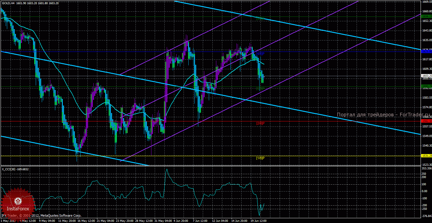 Исходя из картины, сложившейся по золоту 21 июня, видно, что инструмент вчера закрепился ниже скользящей средней, а значит в ближайшие дни может продолжаться нисходящее движение. Старший канал направлен вниз, что свидетельствует о нисходящем направлении движения глобального тренда. Младший канал направлен наверх, что означает восходящее направление движения в среднесрочном плане, это говорит о том, что сейчас можно рассматривать торговлю в обе стороны. На данный момент цена находится ниже мувинга и ниже уровня Мюррея «4/8», что говорит нам о нисходящем направлении движения в ближайшей перспективе. Первой целью нисходящего движения, таким образом, является уровень Мюррея «3/8» — 1593,75, этот уровень уже достигнут ценой, но закрепления ниже пока что нет. В случае преодоления этого уровня Мюррея, следующим таргетом для возможного снижения курса золота будет выступать уровень Мюррея «2/8» — 1562,50. Скользящая средняя направлена вниз, а цена находится ниже нее, поэтому сейчас более вероятно нисходящее движение в ближайшие дни. Хайкен Аши окрасил несколько баров в голубой цвет, что сигнализирует о текущем нисходящем движении, поэтому короткие позиции сейчас актуальны до образования 1-2 баров фиолетового цвета. Вновь рассматривать длинные позиции можно будет после обратного закрепления цены выше мувинга. Индикатор CCI находится около уровня -200, что говорит о сильной перепроданности инструмента, поэтому в ближайшие часы может начаться откат наверх.