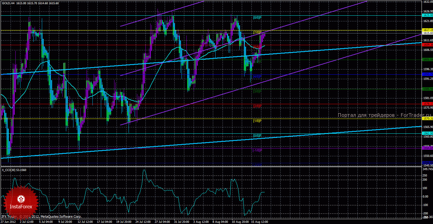 Исходя из картины, сложившейся по золоту 17 августа, видно, что инструмент вновь закрепился выше мувинга, поэтому отторговывать золото на рынке (длинные позиции) можно. Старший канал направлен наверх, что свидетельствует о восходящем направлении движения глобального тренда. Младший канал также направлен наверх, что означает восходящее направление движения и в среднесрочном плане. На данный момент цена находится выше мувинга и выше уровня Мюррея «6/8», что говорит нам о восходящем направлении движения в ближайшей перспективе. Первой целью восходящего движения, таким образом, является уровень Мюррея «7/8» — 1617,15, который уже достигнут ценой. В случае преодоления этого уровня Мюррея, следующим таргетом для возможного повышения курса золота будет выступать уровень Мюррея «8/8» — 1625,00. Скользящая средняя направлена вверх, а цена находится выше нее, поэтому сейчас более вероятно восходящее движение в ближайшие дни. Хайкен Аши окрасил последние бары в фиолетовый цвет, что сигнализирует о текущем восходящем движении, поэтому лонги можно рассматривать до разворота этого индикатора вниз, что укажет на начало новой локальной коррекции. Короткие позиции станут вновь актуальными после разворота одного из каналов линейной регрессии вниз и закрепления цены ниже мувинга. Индикатор CCI находится около уровня 100, что говорит о наличие небольшой перекупленности.