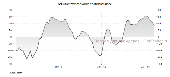 Евро упал на фоне снижения экономических ожиданий в Германии до 16-месячных минимумов. Индекс экономических ожиданий в Германии от ZEW резко снизился в мае максимальными темпами за два года, падение идет уже пятый месяц подряд. Индекс опустился до 33,1 п., по сравнению с 43,2 п. в апреле, превысив ожидания снижения до 41 п. Доверие деловых кругов к экономике страны снижается из-за опасений кризиса на Украине и замедления экономики Китая. Индекс экономических ожиданий в еврозоне также снизился в мае на 6 п. до 9-месячного минимума на уровне 55,2 п.