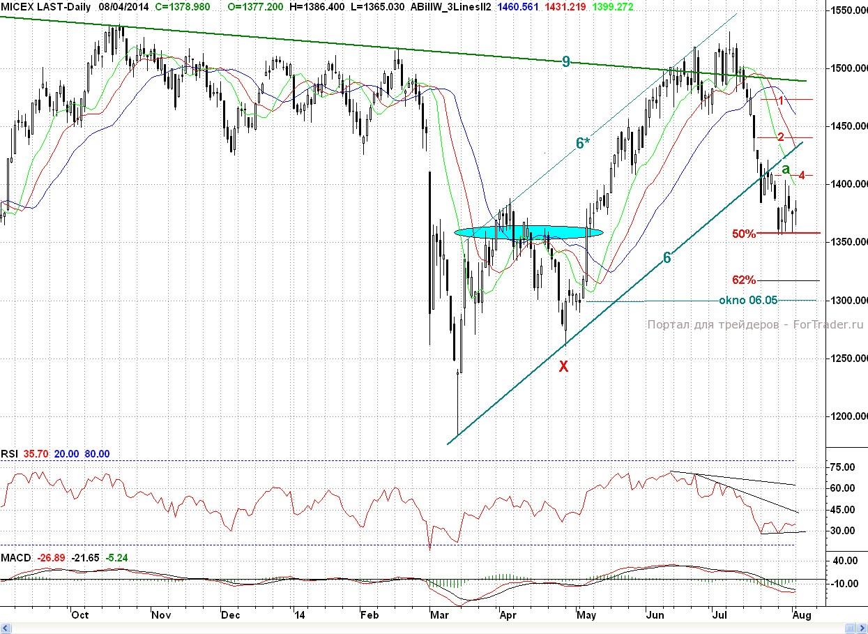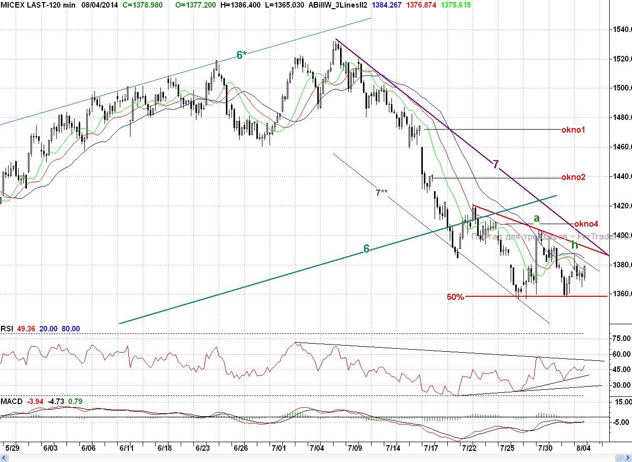 На сегодня ближайшим сопротивлением выступит вчерашний максимум h (1 386,4 п.) и верхняя грань «треугольника». Ключевым редутом медведей остается максимум прошлой недели a (1 403.55 п.) — он же дневной фрактал на покупку, но пока не действительный. По RIU это 121 930 п. и 123 690 п. соответственно. Роль ближайшей поддержки сыграет вчерашний минимум (1 365,03 п.) Основным бычьим рубежом остается уровень 50% коррекции от весеннее — летнего роста (~1 358 п.) и минимум прошлого вторника (1 356, 64 п.). По RIU это 119 280 п. и 118 050 п. соответственно.