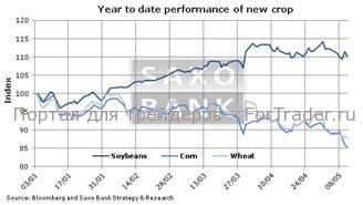 Трейдеры, потребители и производители большую часть времени в этом году уже учитывали такую разницу в прогнозах для трех основных культур, в результате чего цена нового урожая соевых бобов превзошла стоимость контрактов на кукурузу и пшеницу с аналогичным сроком истечения уже приблизительно на 25%. Соевые бобы первоначально подорожали под действием оптимистичного отчета Министерства сельского хозяйства, но впоследствии скорректировались на 2%. Рынок соевых бобов – единственный рынок в сырьевом комплексе, где доля участия инвесторов за последние два месяца увеличилась. Количество чистых длинных спекулятивных позиций по владении хедж-фондов и крупных инвесторов находится на рекордном уровне, что создает риск образования пузыря. Поэтому позитивных фундаментальных факторов для цены может оказаться недостаточно, чтобы предотвратить временную коррекцию, так как соблазн зафиксировать прибыли будет расти, особенно учитывая общее текущее состояние сырьевого сектора.