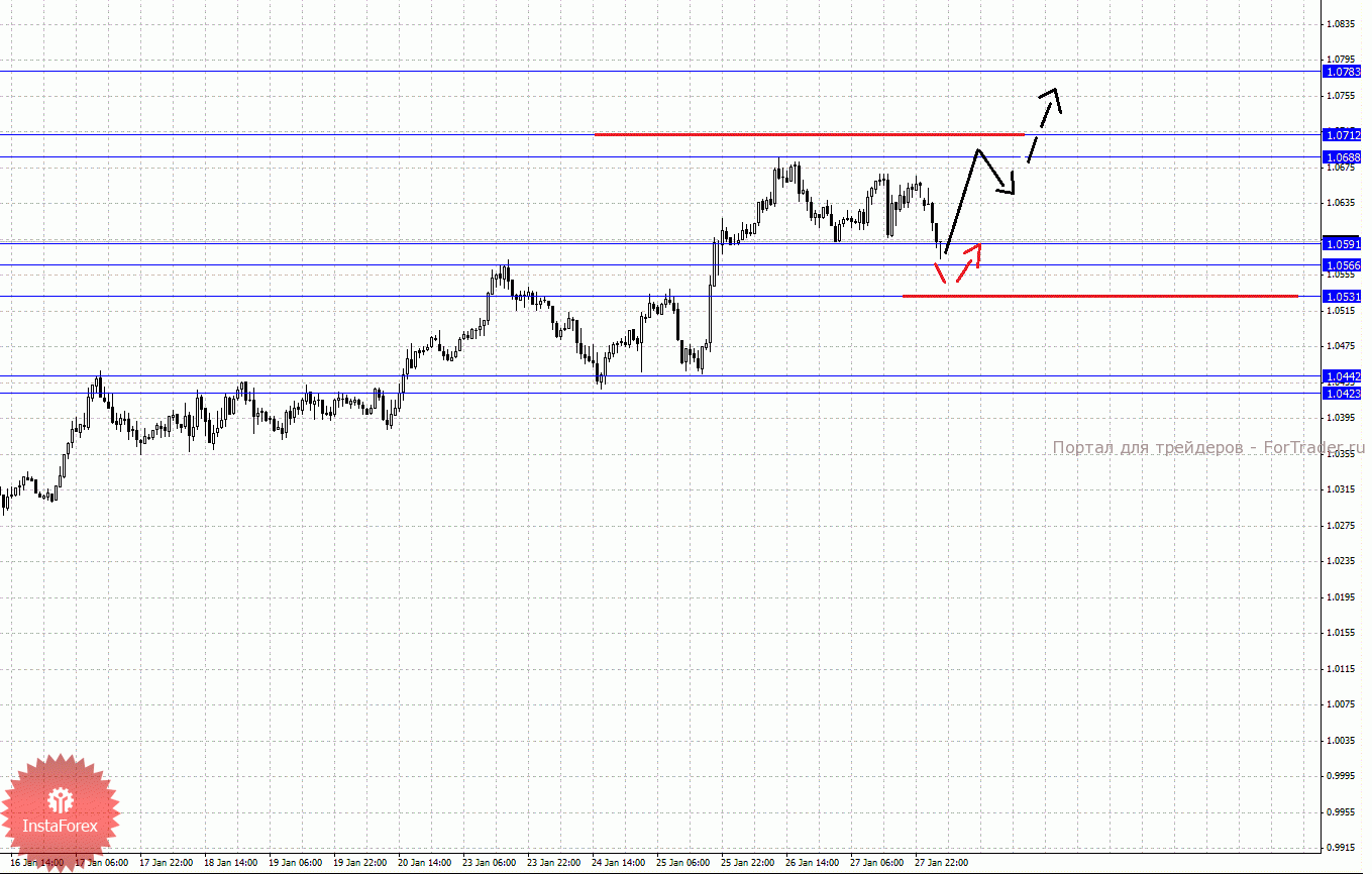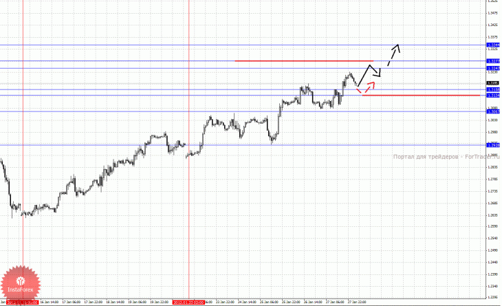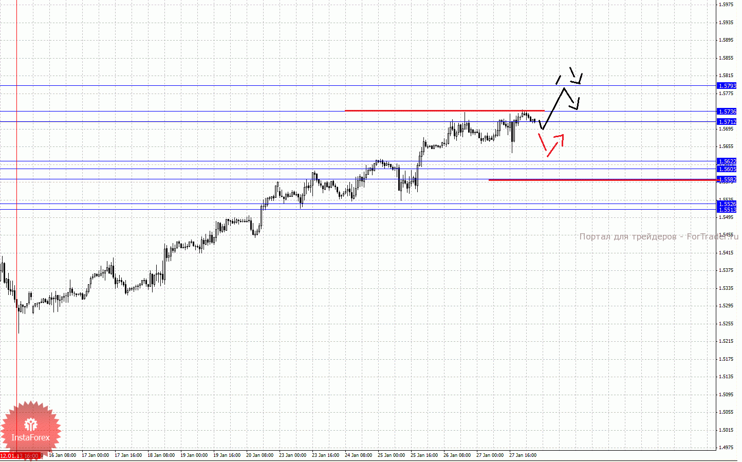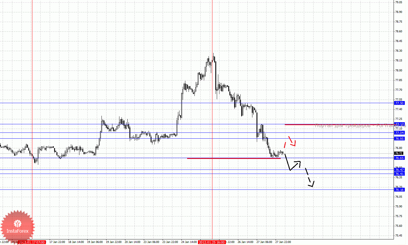 По паре Доллар/Йена ключевыми уровнями являются: 77.50, 77.17, 77.04, 76.95, 76.65, 76.47, 76.41 и 76.16. Здесь цена отменила развитие восходящей структуры от 17 января. На текущий момент мы следим за нисходящим циклом от 25 января. Продолжения движения книзу ожидаем после пробоя 76.65, в данном случае цель 76.47, в коридоре 76.47 – 76.41 консолидация цены. Потенциальным значением для низа считаем уровень 76.16, по достижении которого ожидаем консолидацию. Корректировочное восходящее движение возможно в коридоре 76.95 – 77.04, пробой последнего значения приведет к углубленному движению, здесь цель 77.17, пробой которой, в свою очередь, будет располагать к формированию восходящей структуры, в данном случае потенциальная цель 77.50. В целом, для продолжения восходящей тенденции в масштабе Н1, нам необходимо дождаться оформления локальных начальных условий.