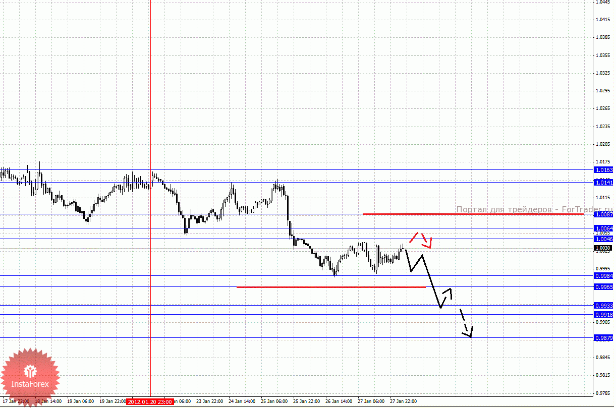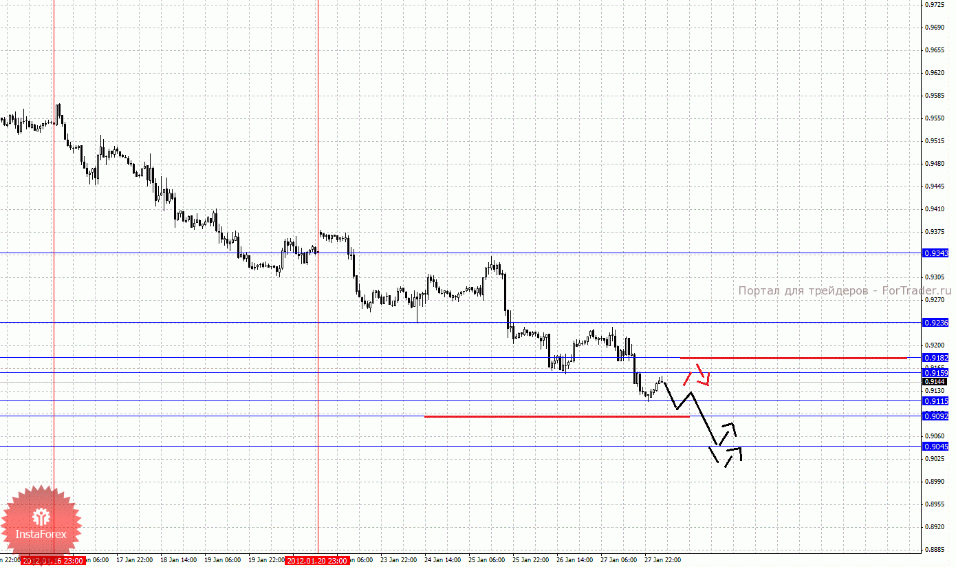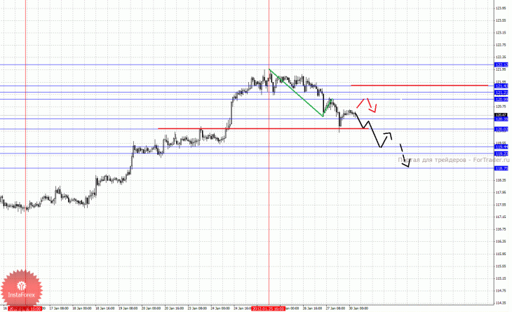 По паре Фунт/Йена ключевыми уровнями являются: 122.12, 121.43, 121.21, 120.99, 120.35, 120.02, 119.44, 119.23 и 118.75. Здесь от 25 января формируется потенциал для развития нисходящей тенденции. Краткосрочное движение книзу ожидаем в диапазоне 120.35 – 120.02, пробой последнего значения должен сопровождаться импульсивным движением, в данном случае цель 119.44, в коридоре 119.44 – 119.23 консолидация цены. Потенциальным значением для верха считаем уровень 118.75, по достижении которого ожидаем откат книзу. Корректировочное восходящее движение возможно в коридоре 120.99 – 121.21. Уровень 121.43 является ключевым сопротивлением для верха, его пробой будет располагать к продолжению развития восходящей тенденции от 16 января, в данном случае потенциальная цель 122.12, до этого уровня мы ожидаем оформления локальных начальных условий.