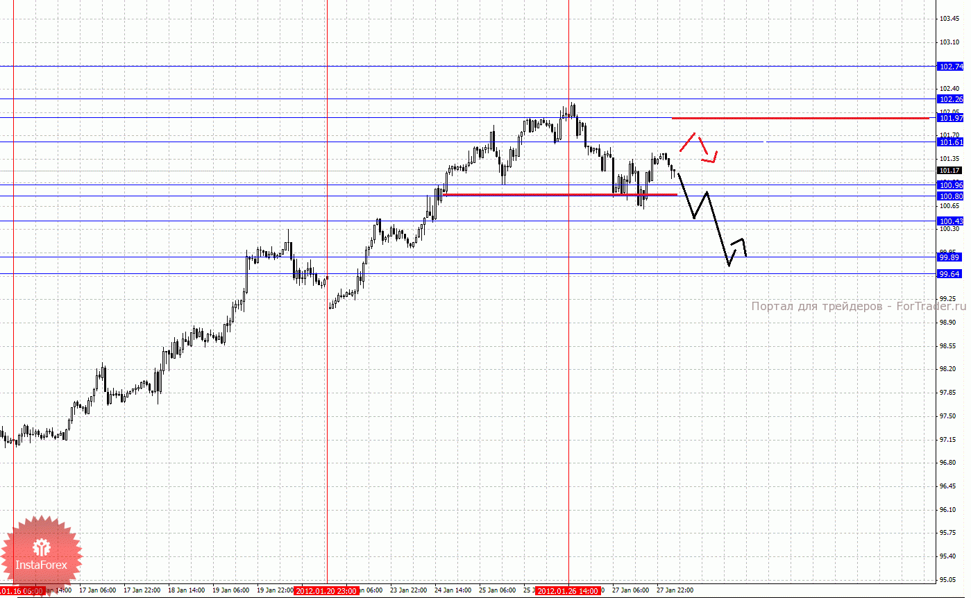 По паре Евро/Йена ключевыми уровнями являются: 102.74, 102.26, 101.97, 101.61, 100.96, 100.80, 100.43, 99.89 и 99.64. Здесь от 26 января формируется потенциал для развития нисходящего движения. Проход ценой шумового диапазона 100.96 – 100.80 будет располагать к развитию нисходящей структуры, в данном случае первая цель 100.43, по достижении этой цели возможна консолидация цены. Пробой уровня 100.43 приведет к импульсивному движению, здесь цель – 99.89, в коридоре 99.89 – 99.64 консолидация цены. Уровень 101.61 является ключевой поддержкой для низа, его пробой будет располагать к развитию восходящей структуры, в данном случае цель – 101.97, в коридоре 101.97 – 102.26 консолидация цены. Потенциальным значением для верха считаем уровень 102.74, движение к которому ожидаем после пробоя 102.26.
