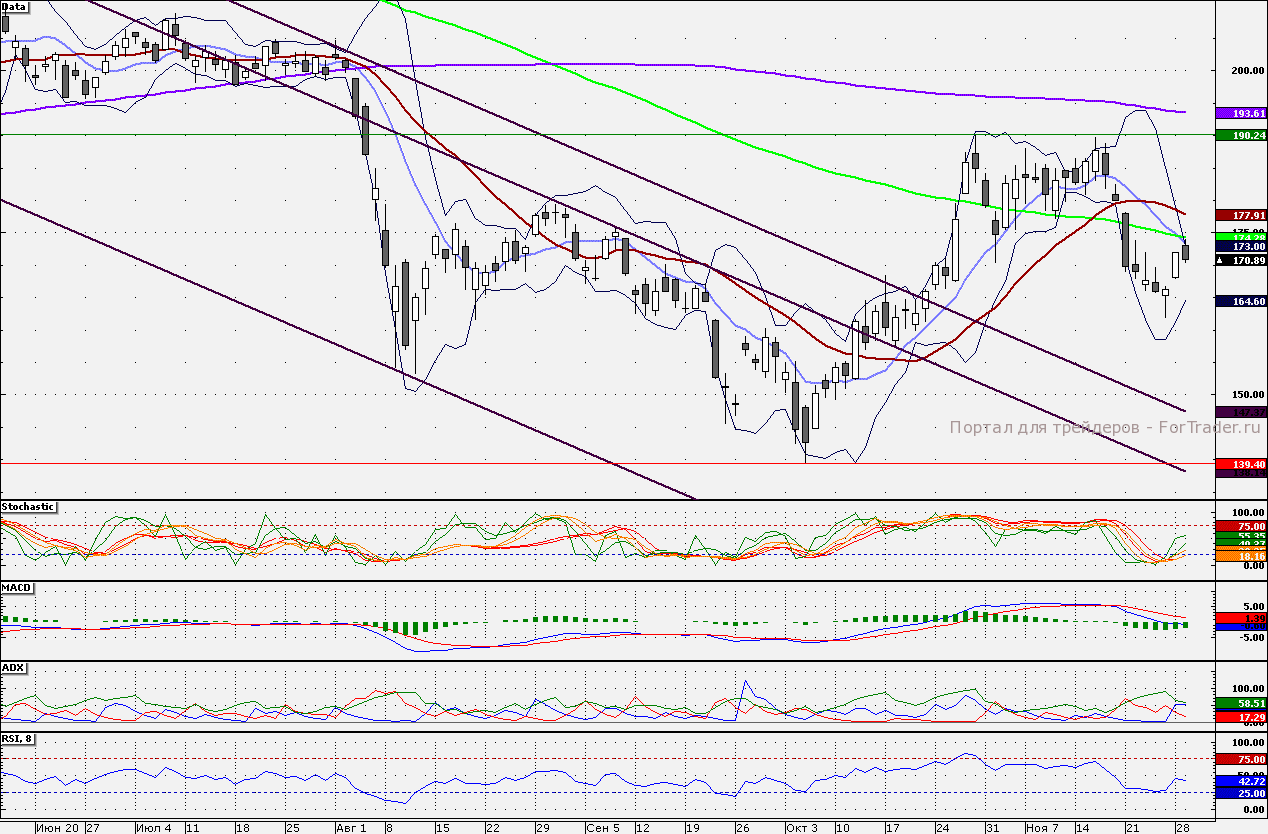 Акции «Газпрома» во вторник протестировали 174 руб., после чего акции вновь откатились к отметке 170 руб. Пробитие вниз данной отметки будет способствовать закрытию гэпа, сформированного 28 ноября – 166,28 руб. Сопротивлением по-прежнему является 175 руб.