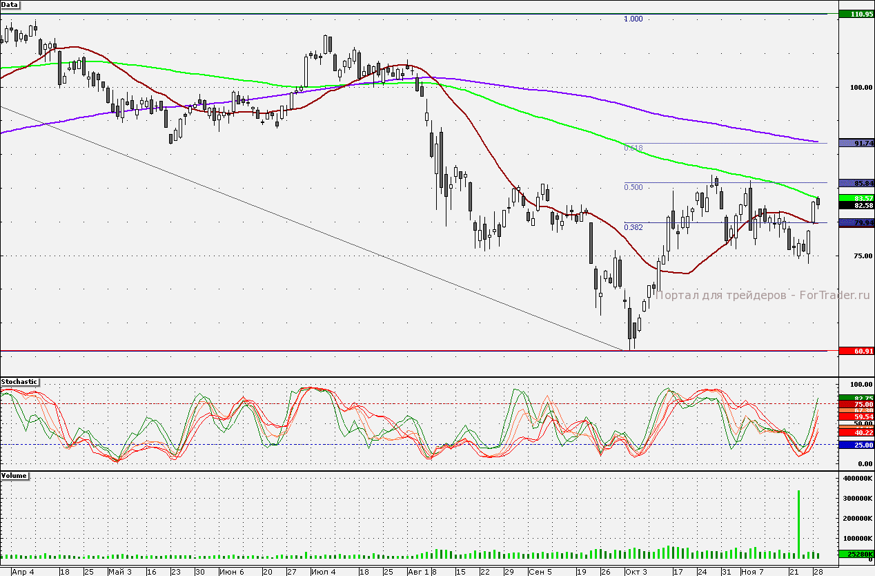 Акции банка протестировали 100-дневную скользящую среднюю – 83,57 руб., вблизи которой состоялось закрытие. Сопротивлением является 85 руб. Поддержкой является 80 руб., чуть ниже данного уровня проходит 21-дневная скользящая средняя (79,77 руб.).