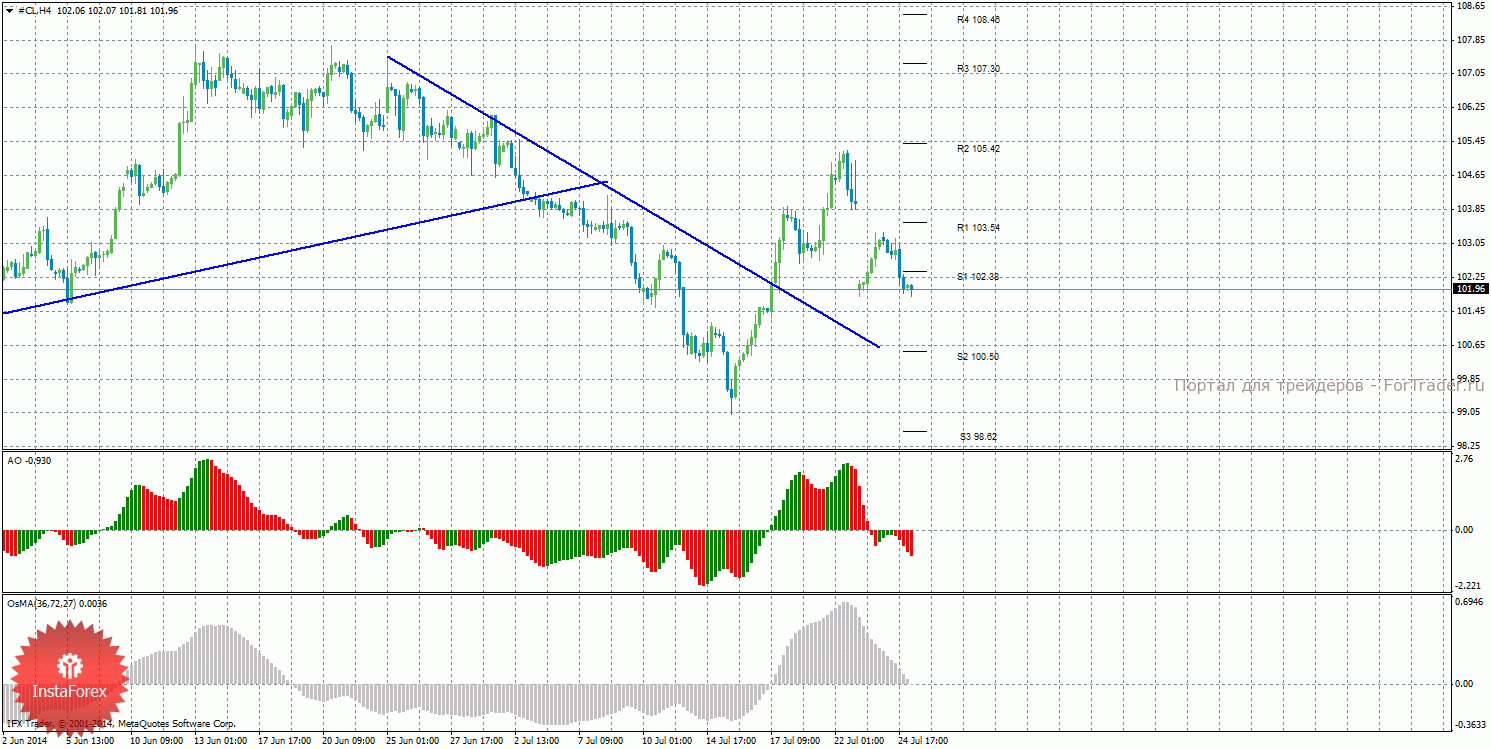 В ходе проведенного анализа движения цены на нефть, можно сделать вывод, что сейчас можно рассматривать ордера на покупку с целями 103,54 и 105,42. Стоп лосс выставляем ниже ближайшего уровня поддержки. При заходе сделки в прибыльность в безубыток. Если цена закрепится выше уровня 102,38, это может засвидетельствовать завершение нисходящей коррекции, как и разворот наверх Awesome или OsMA. Короткие позиции сейчас не актуальны.