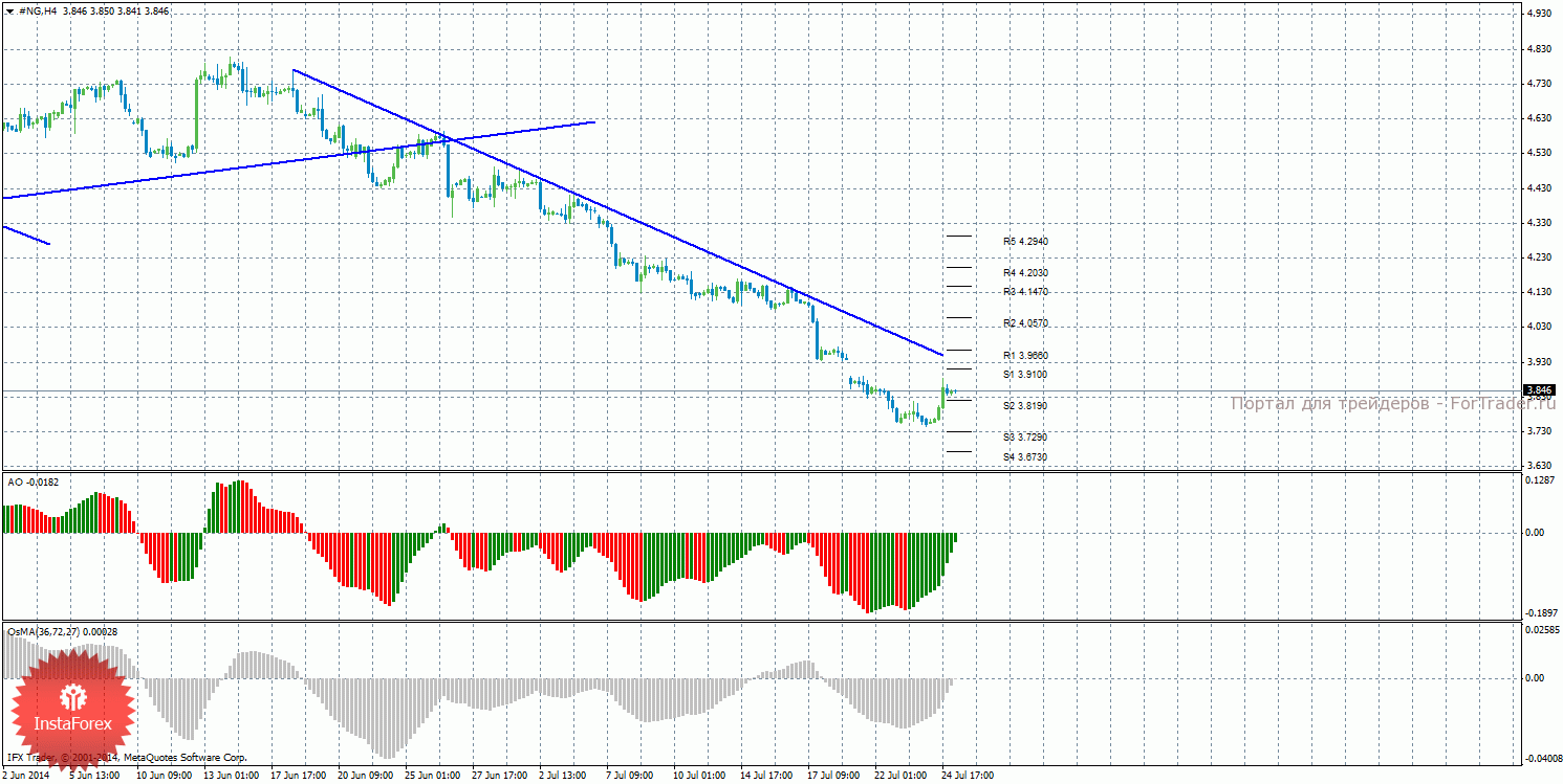 Анализ природного газа за 25 июля показывает, что цена закрепилась выше уровня 3,8190 и начал коррекционное движение с целью линия тренда. На данный момент актуально нисходящее движение с целями уровни поддержки S3 –3,7290 и S4 – 3,6730, если цена закрепится ниже уровня 3,8190. Целями для продолжения восходящей коррекции выступают уровни 3,9100 и 3,9660, если цена останется выше уровня 3,8190. Построена нисходящая линия тренда, которая оказывает поддержку торгующим на понижение и делает актуальными ордера на продажу. Индикатор Awesome показывает локальное восходящее движение, последний закрытый бар окрашен в зеленый цвет. OsMA также направлен наверх, что сигнализирует о восходящем движении цены на газ и в более долгосрочной перспективе. Отскок цены от линии тренда может спровоцировать завершение восходящей коррекции.