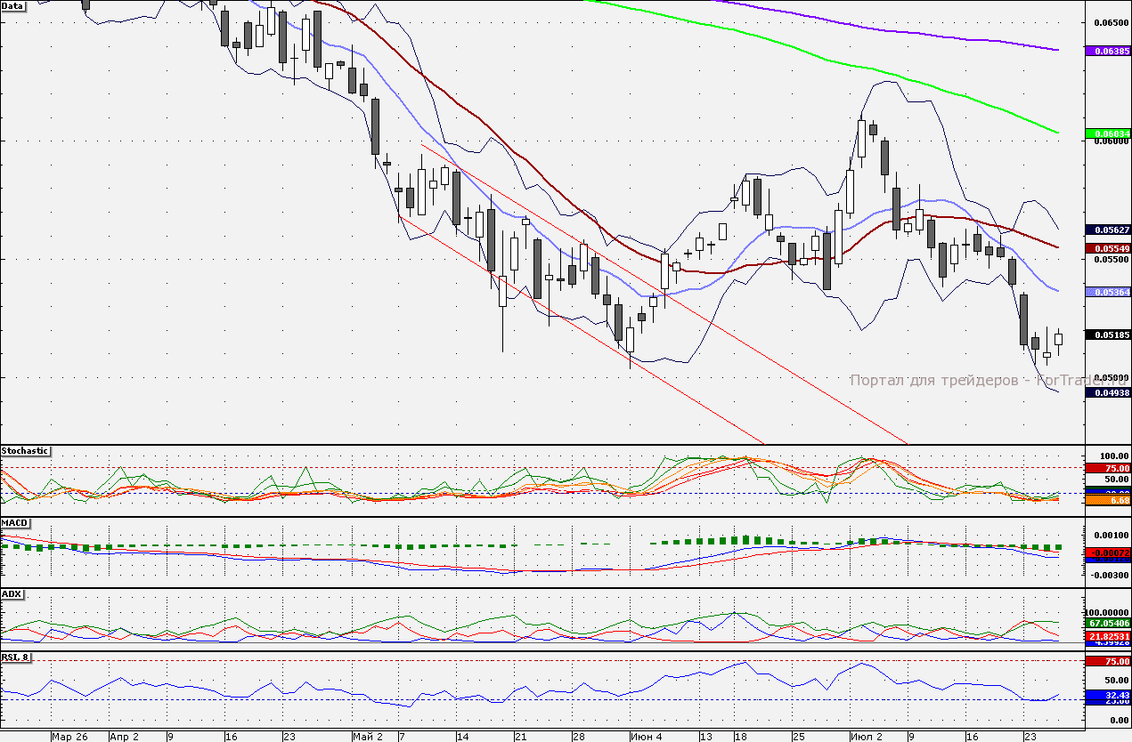 Акции ВТБ накануне развернулись вверх от 5,0 коп. Акции протестировали сопротивление 5,2 коп., но не смогли пройти его. В случае если уровень будет пройден, то целью станет 5,364 коп. – 10-дневная скользящая. Поддержкой остается 5,0 коп.
