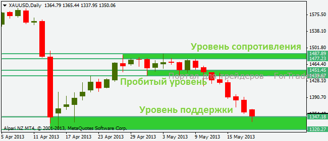 Рынок золота продолжает снижаться и в данный момент достиг ключевого уровня поддержки 1320 – 1347$ (Спот). Уровень сформировался во время апрельского снижения рынка и отчётливо просматривается на дневном и недельном таймфреймах. Сам факт того, что цена подошла к этой зоне уже является сигналом к фиксации результата по открытым ранее коротким позициям. Подобные уровни часто выступают в качестве целей при частичной фиксации результата среди крупных трейдеров.