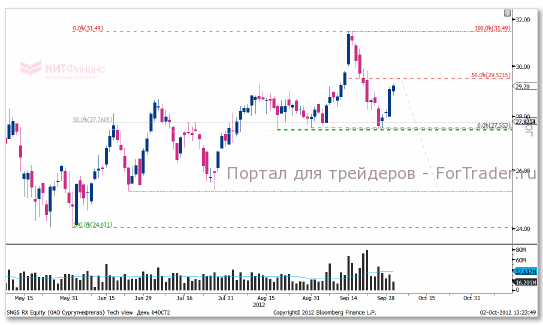В понедельник, в последний час торговой сессии «Сургутнефтегаз» обновил максимум прошлой недели, 28,99 руб. Более того, сегодня в первой половине торговой сессии цена закрепилась выше этого уровня. Однако в ближайшей перспективе продолжению роста угрожает сильной сопротивление на 29,50 рублях. Здесь располагается 50%-ый уровень коррекции двухнедельной волны падения после объявления о начале QE3. От этого уровня цена может отскочить и взять курс на тестирование нижней поддержки.