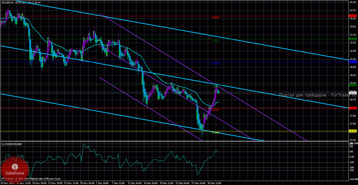 Исходя из анализа серебра 4 января видно, что серебро также сменило направление движения и по нему сейчас также не рекомендуется торговать, так как оба канала направлены вниз. Старший канал направлен вниз, что свидетельствует о нисходящем направлении движения глобального тренда. Младший канал направлен вниз, что означает нисходящее движение в менее долгосрочном плане. Сейчас цена находится выше мувинга и выше уровня Мюррея «2/8», что делает актуальным восходящее движение. Первой целью восходящего движения является уровень Мюррея «3/8» — 29,69, но торговать на повышение не рекомендуется. В случае преодоления первого целевого уровня, восходящее движение продолжиться с целью «4/8» — 31,25. Скользящая средняя направлена вверх, а цена в свою очередь находится выше нее, что сигнализирует о текущем восходящем движении. Рассматривать торговлю на повышение можно будет не ранее разворота одного из каналов линейной регрессии наверх. Короткие же позиции можно будет рассматривать только после закрепления цены ниже мувинга. Хайкен Аши окрасил несколько баров в голубой цвет, что сигнализирует о локальном нисходящем движении, что не позволяет сейчас открывать лонги, в целом длинные позиции также сейчас не актуальны. Индикатор CCI находится около уровня 100, что свидетельствует о небольшой перекупленности курса серебра.