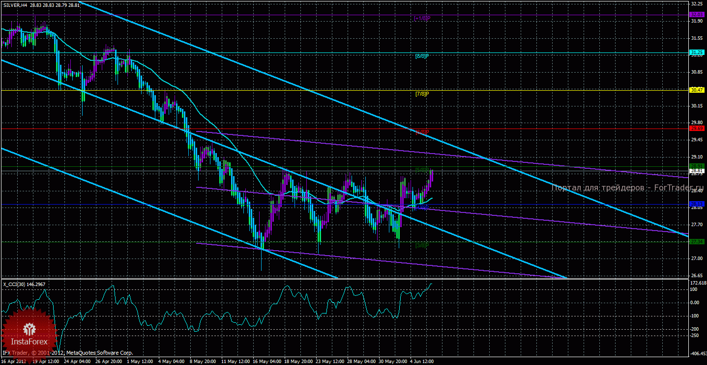 Исходя из анализа серебра 6 июня, видно, что цена закрепилась выше скользящей средней, причем уже в очередной раз за последний месяц, торговля на повышение по-прежнему не актуальна. Старший канал направлен вниз, что свидетельствует о нисходящем направлении движения глобального тренда. Младший канал направлен вниз, что означает нисходящее движение и в менее долгосрочном плане. Сейчас цена находится выше мувинга и выше уровня Мюррея «4/8», что делает более вероятным продолжение восходящего движения. Первой целью восходящего движения является уровень Мюррея «5/8» — 28,91, однако, открывать длинные позиции с этой целью пока что не рекомендуется. Если курс серебра сумеет закрепиться выше этого уровня, то восходящее движение может продолжиться с целью «6/8» — 29,69. Скользящая средняя развернулась вверх, а цена в свою очередь находится выше нее, что сигнализирует о текущем восходящем направлении движения. Длинные позиции будут вновь актуальны только после разворота одного из каналов регрессии наверх с целью 29,69. Короткие же позиции будут актуальны только после обратного закрепления курса ниже мувинга. Хайкен Аши окрасил последние бары в фиолетовый цвет, что сигнализирует о локальном восходящем движении, но при любых показаниях индикатора лонги сейчас не актуальны. Индикатор CCI находится около уровня 100, что свидетельствует о небольшой перекупленности инструмента.