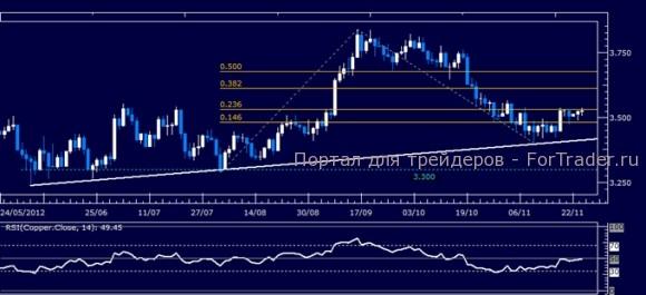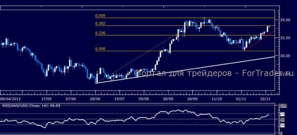 Цены тестируют сопротивление на уровне 34.18, 38,2% расширение Фибоначчи. Прорыв вверх направлен к отметке 50% уровня при 35.29. Краткосрочная поддержка тренда расположена на уровне 32.96, усиленном 23,6% уровнем Фибоначчи при 32.84. Прорыв ниже указанной отметки направлен в область минимума 5 ноября при 30.65.