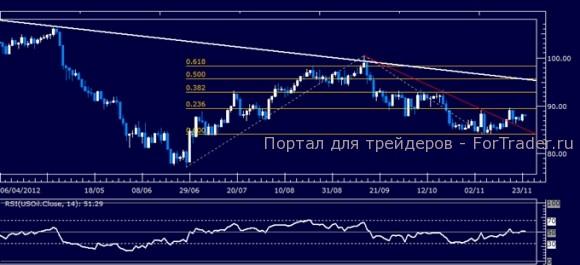 Цены проводят консолидацию под сопротивлением на уровне 89.48, 23,6% расширение Фибоначчи, после прохождения выше нисходящего тренда, установленного от максимума 14 сентября (84.95). Прорыв вниз направлен к отметке минимума 7 ноября (84.04). Прорыв выше сопротивления направлен в область 38,2% уровня при 92.88.