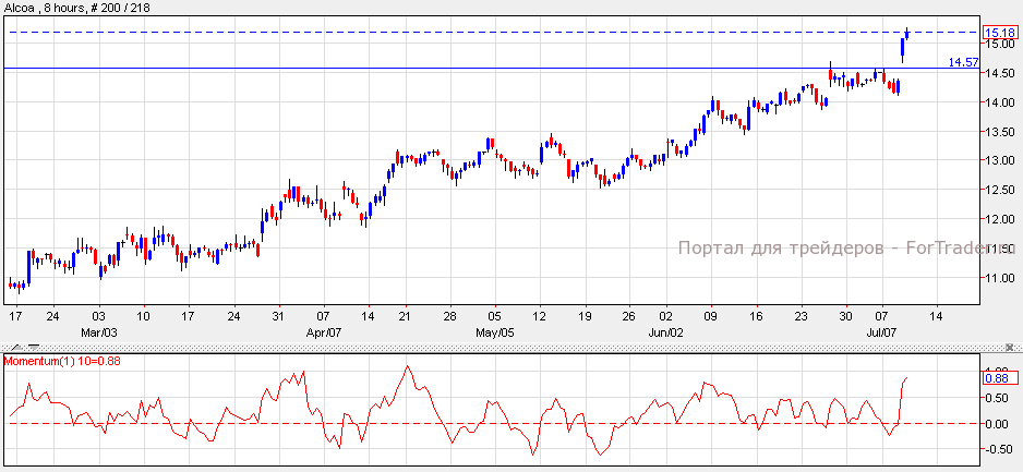 Акции Alcoa подорожали на 5.66% до цены $15.69, после высоких квартальных доходов компании. Пока цена акций держится выше уровня поддержки $14.50 с индикатором Моментум выше 0, ценные бумаги могут вырасти к отметке $16.50. Прорыв ниже текущего уровня поддержки снизит акции к отметке $13.50.