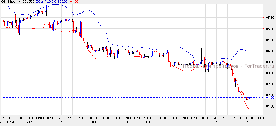 Нефть подешевела на 1.52% до $101.83 за баррель, на фоне слабых отчетов по нефтяным запасам в США. Согласно техническому анализу 1-часового графика, нефть находится вблизи нижней полосы Боллинджера и может вырасти к отметке $102.50, чтобы закрыть стандартное отклонение разрыва. Тем не менее, прорыв нижней полосы приведет черное золото к отметке $100.50.