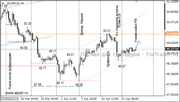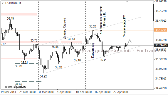 В четверг спекулянты отказались от покупок рубля, не воспользовавшись техническими факторами. Во второй половине дня ситуация на валютном рынке для рубля резко ухудшилась. Россия в ответ на спецоперацию в Славянске начала военные учения на границе, а президент Путин назвал киевские власти хунтой и предупредил их об ответственности.