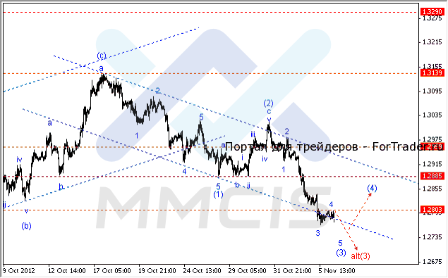 Как и предполагали аналитики, в ходе вчерашних торгов пара продолжала снижение в рамках третьей волны пятиволновой структуры волны «(с)» старшего порядка. В то же время целевой уровень 1.2720 так и не был достигнут, что, по мнению аналитиков, указывает на то, что волна «3» еще не завершена.