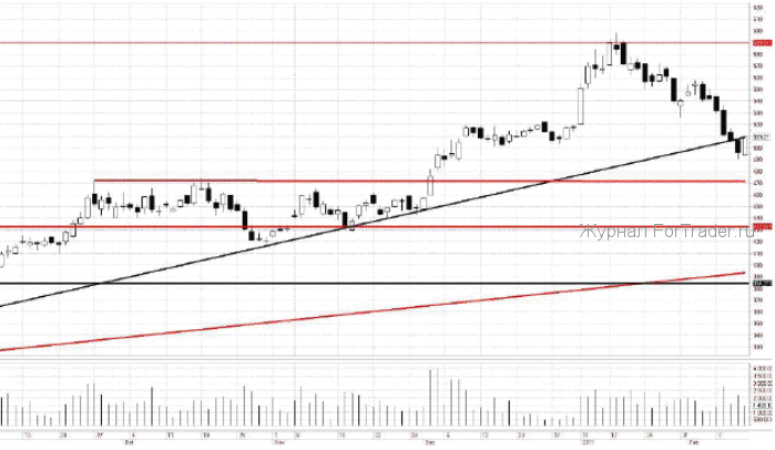 Рассмотрим акции Северстали с позиции технического анализа. В своем восходящем движении акции прикрыли геп от 03.07.2008 в районе 575 р., заодно реализовав фигуру восходящий треугольник, сформированную в октябре прошлого года. Вчера продавцы предприняли попытку сломать среднесрочный восходящий тренд, и сегодня участники торгов наблюдают возвратный ход. В случае, если покупателям не удастся вернутся в тренд, ближайшей поддержкой будет выступать отметка на 470 р.