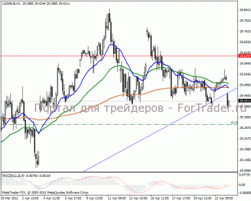 Часовой период показывает продолжение растущей тенденции, произошел пробой локального тренда и стремление прощупать отметку 29.31 пунктов. Вероятнее всего внутри дня так и сложится, но дальнейшее движение будет только в растущей тенденции, поскольку произойдет, как минимум, отыгрыш негативных факторов, относительно рубля. Цель – пробой сопротивления в отметке 29.62 пунктов.