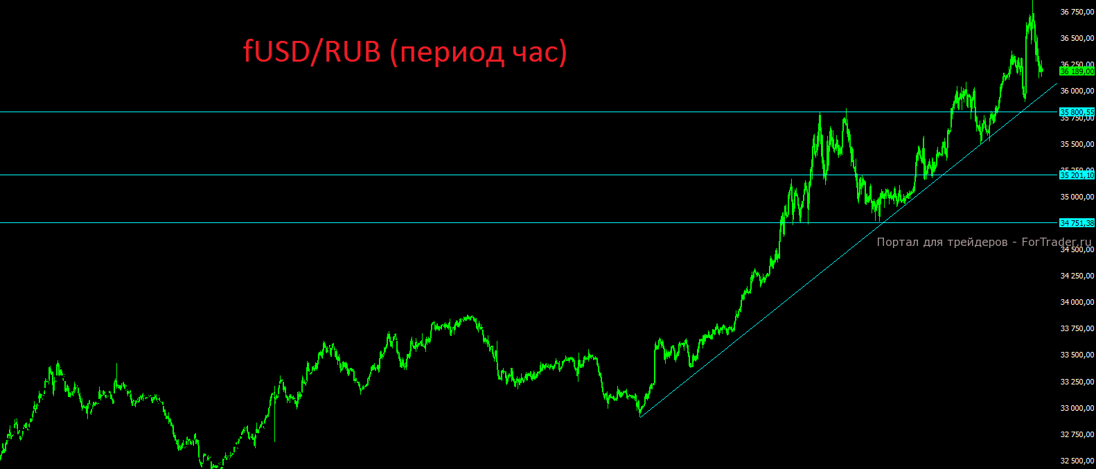 Фьючерс на валютную пару доллар-рубль пока продолжает чётко находиться в восходящем тренде. Цели по рублю в паре с долларом в диапазоне 37-38 мы скорее всего до лета ещё увидим. Никаких фундаментальных причин для укрепления рубля ниже отметки 35 на горизонте пока нет. Сегодня состоится аукцион ОФЗ, что может незначительно поддержать российскую валюту.
