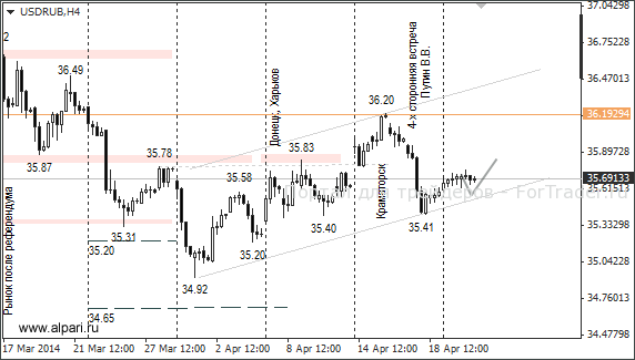 Правительство Украины в рамках Женевского соглашения приостановило антитеррористическую операцию в восточных регионах страны, что было положительным фактором для рубля. Вчера исполняющий обязанности президента А. Турчинов потребовал от силовых структур страны возобновить спецоперацию. Поводом для такого решения стало убийство депутата партии «Батькивщина» Владимира Рыбака.