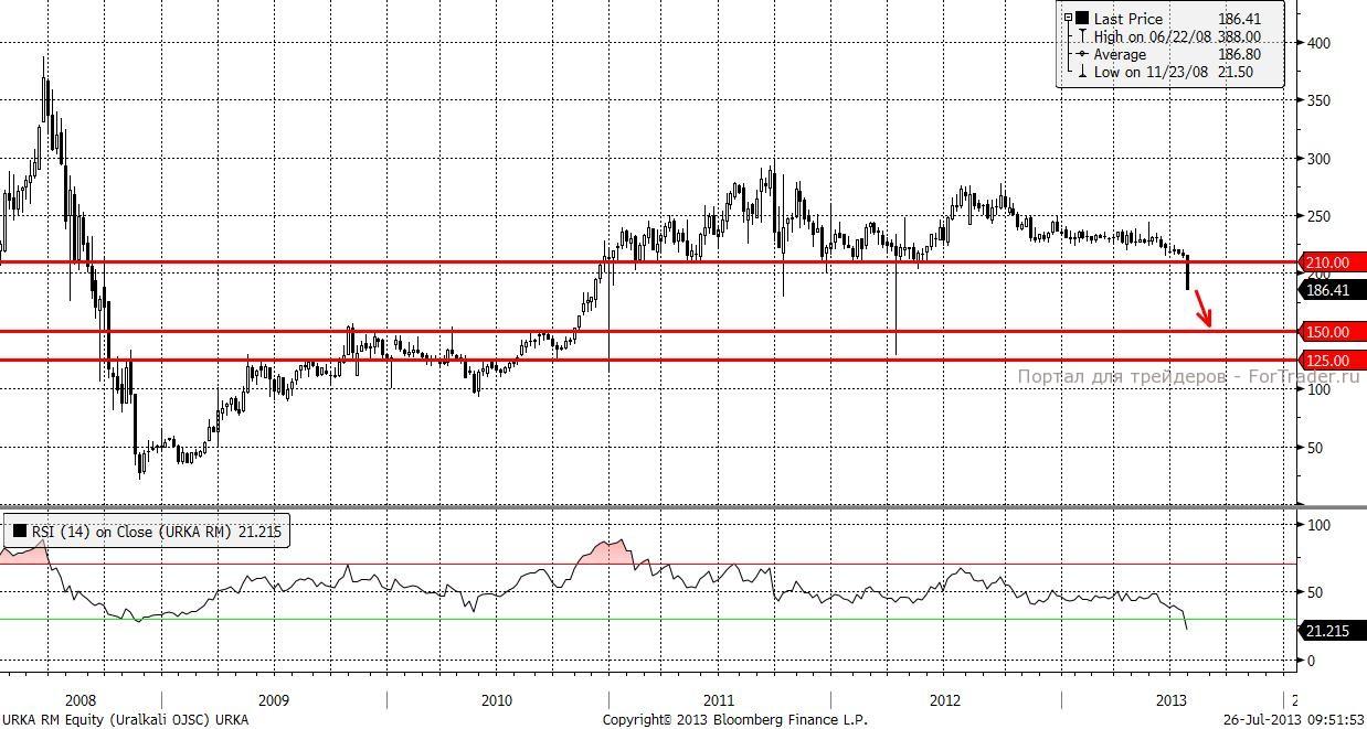 Пару слов об Уралкалии. Прошли золотые времена данной фишки. Деньги на поддержание стоимости акций постепенно истощаются, что приводит к пробитию важных уровней. Одним из последних рубежей “быков” был уровень 210, но и он со свистом был пробит. На наш взгляд, дорога открыта для падения к 150 и 125 руб. за акцию.