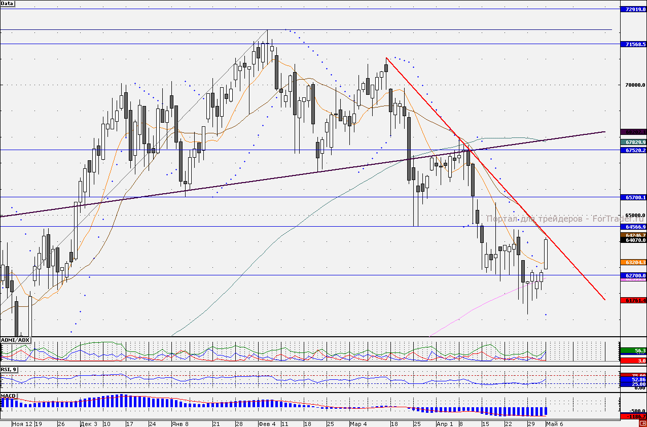 Динамику лучше рынка в первой половине дня демонстрируют привилегированные акции «Транснефти». В конце апреля акции, наконец, реализовали «медвежью» цель (61 500 руб.) по образованной на дневном графике фигуре разворота тренда «голова и плечи», что способствовало формированию отскока вверх. Судя по показаниям трендовых индикаторов, позитивная динамика акций в ближайшее время может быть продолжена. Индикатор ADMI/ADX показывает, что преимущество сохраняется на стороне покупателей (линия «быков» находится выше линии «медведей»). Так же на стороне покупателей выступает снижение гистограммы MACD(12;26;9) на отрицательной территории. Однако текущий рост инвесторам менее склонным к риску все же стоит использовать для закрытия спекулятивных «лонгов», поскольку в целом техническая картина на графике продолжает оставаться негативной. В первой половине дня бумаги приближались к важному сопротивлению – 64 230 руб., где располагается линия нисходящего тренда, актуальная с середины марта текущего года. Кроме того, данная отметка усилена близостью прохождения 21-дневной скользящей средней. Таким образом, привлекательность краткосрочных длинных позиций вновь возрастет лишь после закрепления над линией нисходящего тренда. Наш 5-минутный торговый робот находится в «лонгах», удерживая длинные позиции от отметки 62 700 руб., но при ухудшении настроений готов перевернуться.
